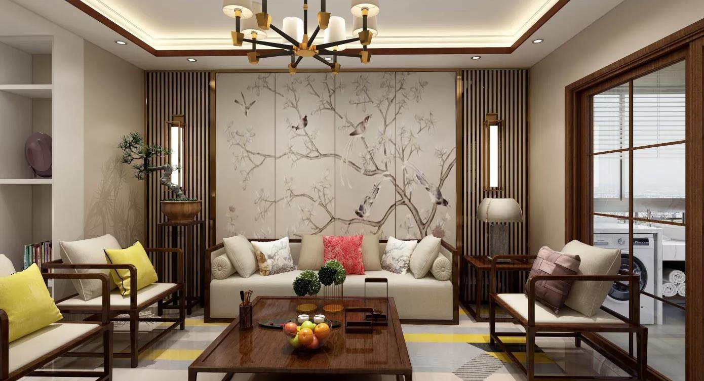 沙发背景墙采用具有意境的中国花鸟画,有古代韵味的壁灯,,象征长寿的盆景,线条简单的木制家具,让客厅显得轻盈,淡雅。