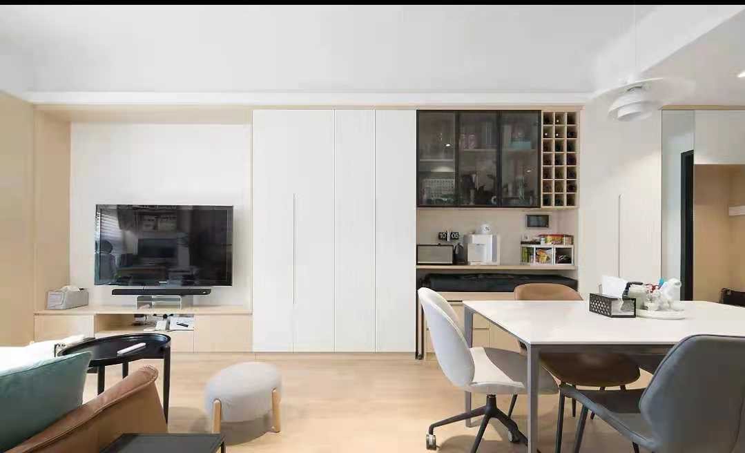 客餐厅是家里的收纳主力,一整面的收纳柜齐平,所有的柜门采用暗扣手,无把手设计更显得空间线条干净