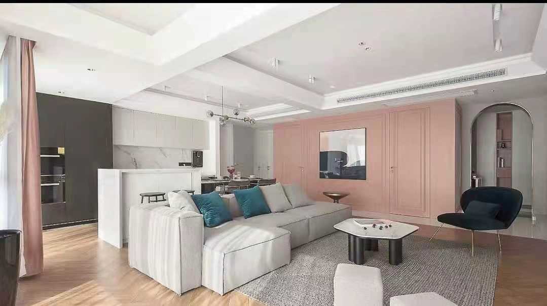 墙面的脏粉色是现场做的油漆,为了综合粉色墙面挂了一幅大的抽象画,让墙面显得不是那么空