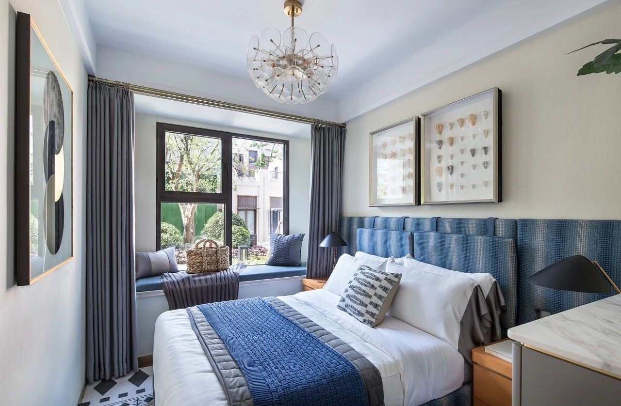 整个卧室也是用了很多蓝色来布置,墙上的贝壳标本是业主每次去海边捡回来收集的,特别的***。