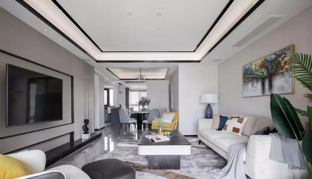 客厅利用黑框设计感和简约的地台板,打造出颇具后现代艺术感的电视背景墙。吊顶的黑边设计,也贴合整体风格,非常简约时尚。