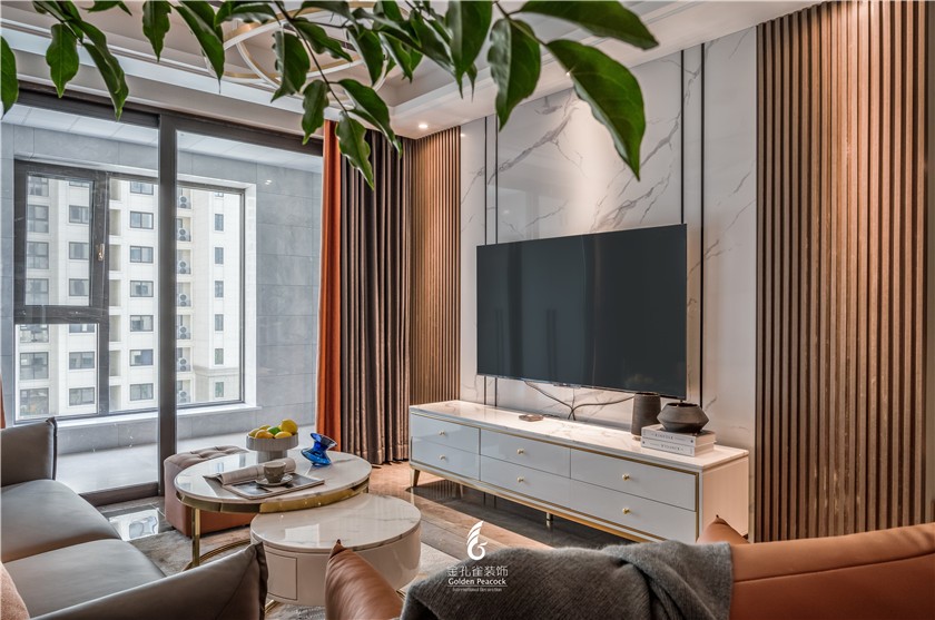 客厅重点突显家具品质在空间中的重要性.胡桃木色的格栅凹凸起伏, 与大理石形成不同色阶的对比与延伸。高贵的咖色大理石为基调搭配出低调奢华之感,茶几金属材质点亮了空间活力,空间疏密有致,调节空间节奏感,进而使环境和谐有序。