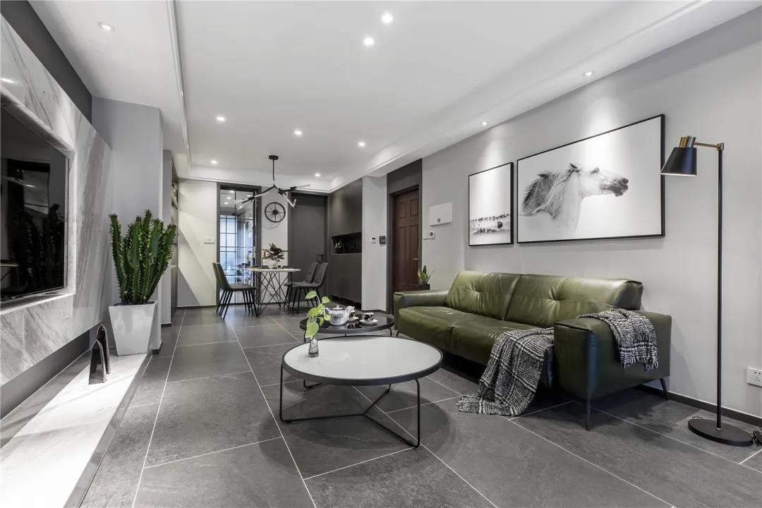 客厅整体深色地砖与白色顶高层次的对比。简单干净