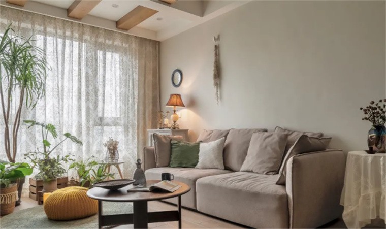 沙发一边选择边桌搭配蕾丝桌布,绿植与吊线灯增添自然复古的味道