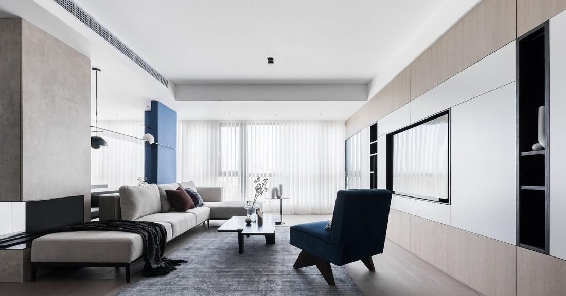 客厅明亮通透,整体色调淡雅自然。木地板和电视柜的木饰面相互呼应,柔和又温馨。 木格栅和水泥漆有一种低调内敛的硬朗,而丝绒沙发和飘逸的垂直帘,又表达出清新柔美的气质。