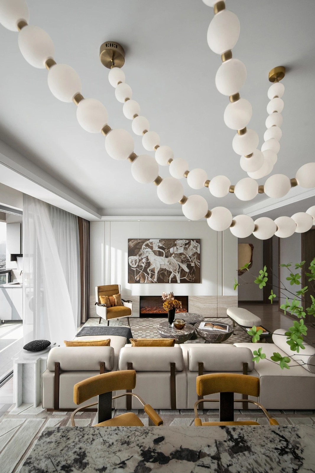 餐厅空间的每一寸空间都充满设计的细节,形态破碎的墙面装饰搭配立体的黑白雕塑作品,比起单纯的平面更显张力,它们前后远地摆放在餐厅角落,用节奏层次让想象得到无限延伸。 低垂的吊灯,由一串吹制的玻璃拼接黄铜链条,形似女士的珍珠项链,与定制的大理石餐桌在空间中形成一幅概念的意象图画。