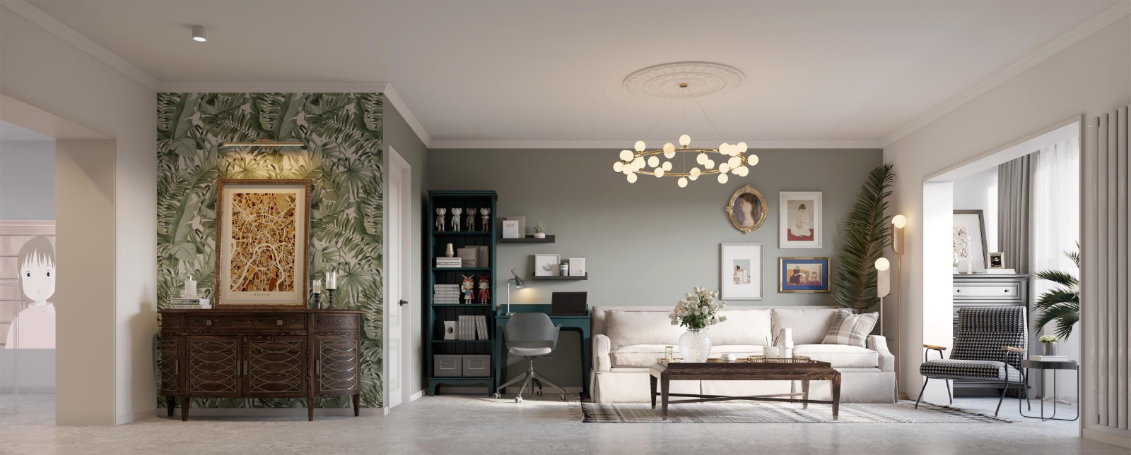 客厅空间比较宽敞,新增一间足够容纳女主人的衣物首饰的步入式衣帽间,整体风格以复古美式为基调,浅绿色乳胶漆和壁纸的点缀,使得整个空间更加温馨舒适。