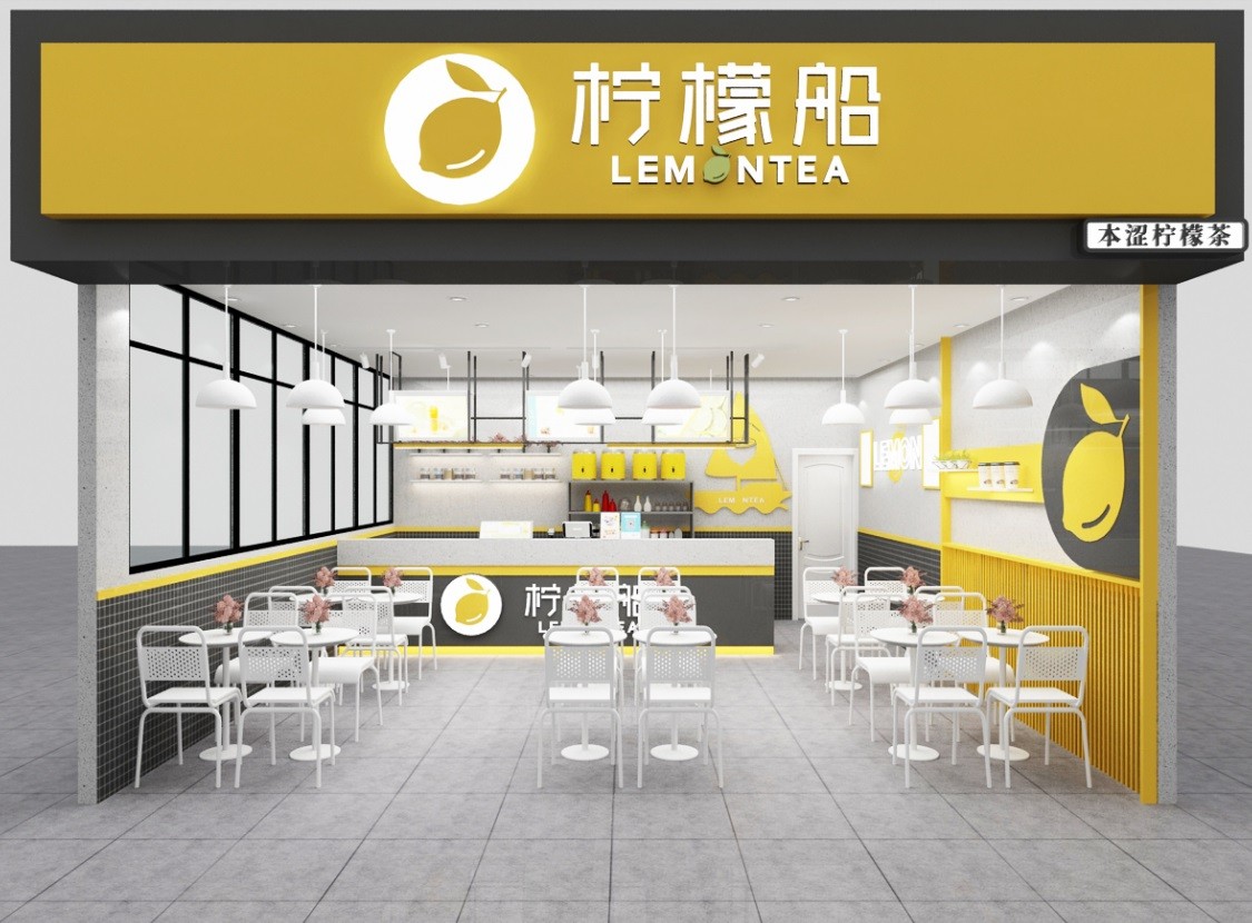 柠檬色门头设计,呼应奶茶店店名及产品,整体动线流畅。