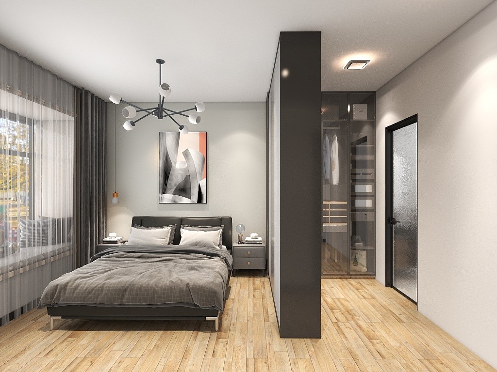 主卧以米色为主基调,使用衣柜作为隔断打造出衣帽间,让功能更明确。