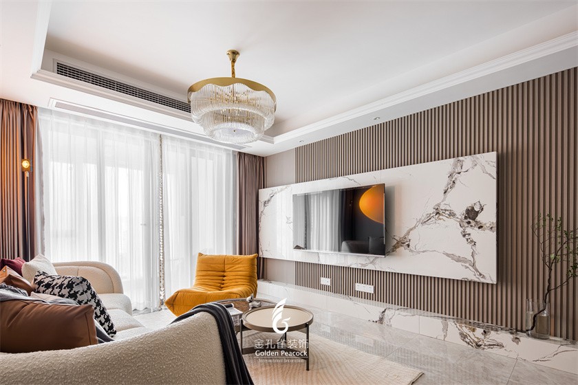 客厅,灰白两色为屋主营造简约的空间基调, 大理石、木饰面、岩板、玻璃等材质的运用,突出极简现代的品质感。嘉宝莉漆干燥迅速,一般的油漆干燥时间需经过24小时,只要十几分钟就可干燥。这样就大大节省施工时间,提高工作效率。
