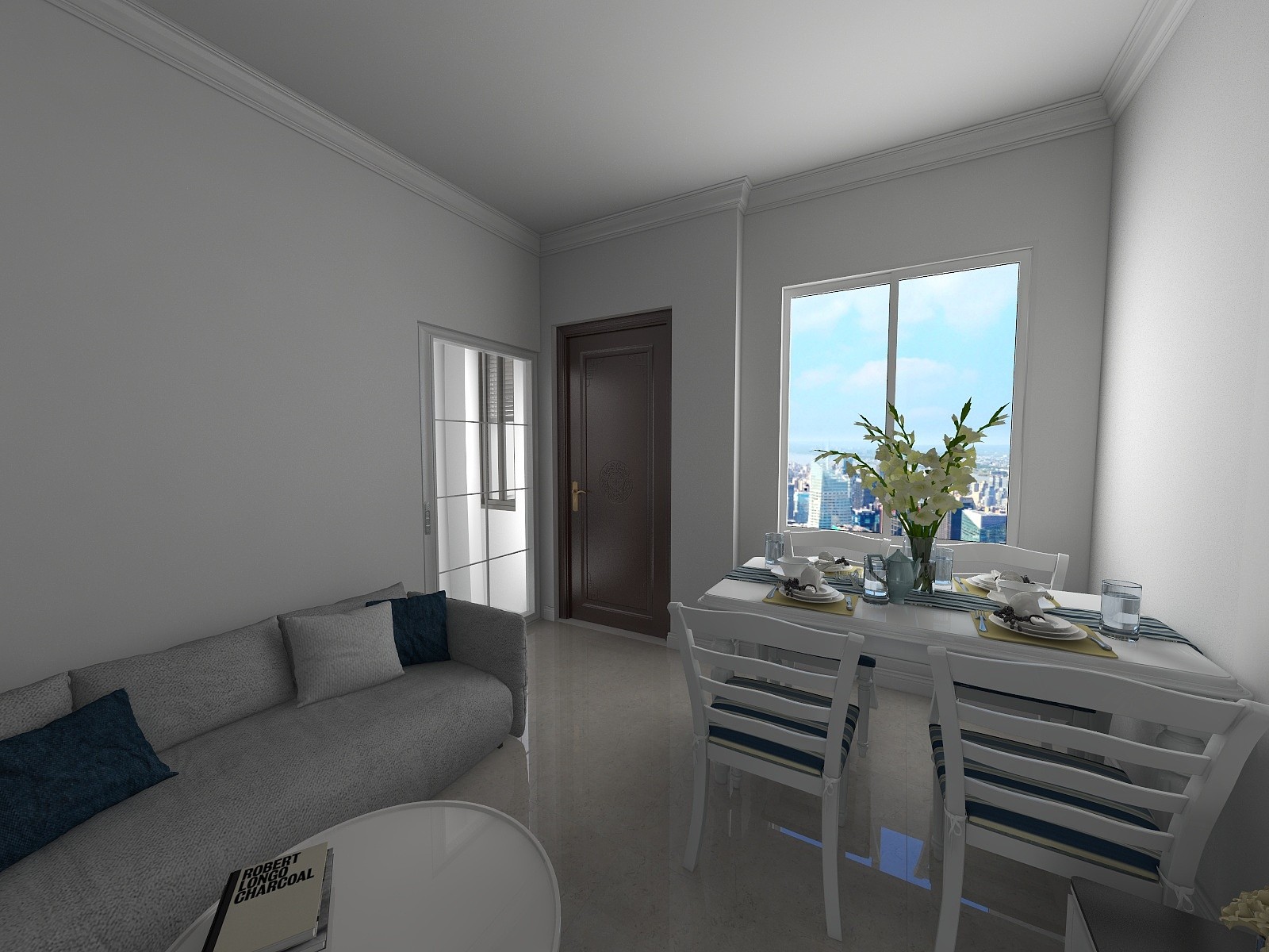 客餐厅桌面用浅蓝色桌布,竖条木纹显得空间大