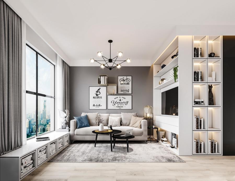 灰色墙漆设计,配上简单的装饰画,释放空间场域,科学规划多元生活与人居体验,将舒适感与设计感自然融合