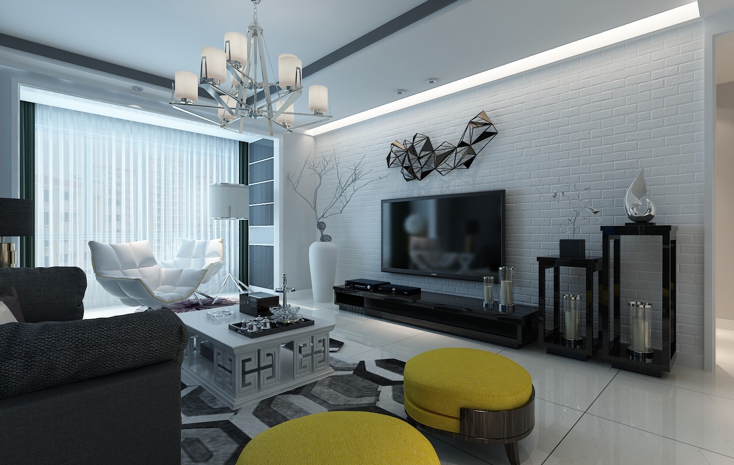 电视背景墙以带灯带的墙面工程,有跳色的搭配点缀