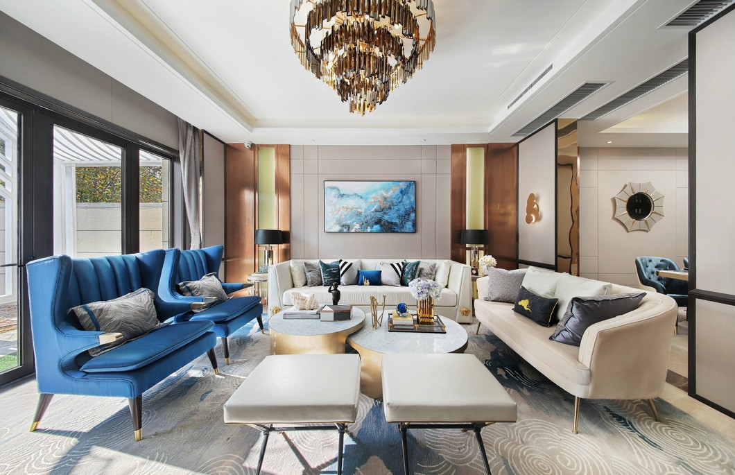 客厅以白色与香槟色为基础色调,让客厅风格显得干净明快,灵动的金属光泽巧妙地塑造了客厅的空间感,让客厅的视觉空间得到了极好的延伸和拓展。 明亮的主色调搭配鲜艳蓝色的点缀,让客厅在充足的光线下焕发出充沛的朝气与活力,令人感到温暖而舒畅。
