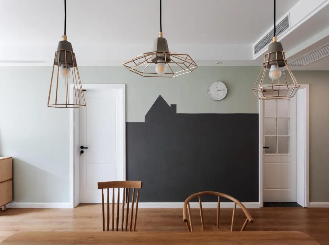 餐厅的对面刷了磁力黑板墙,方便小朋友写写画画,从小养成好习惯。