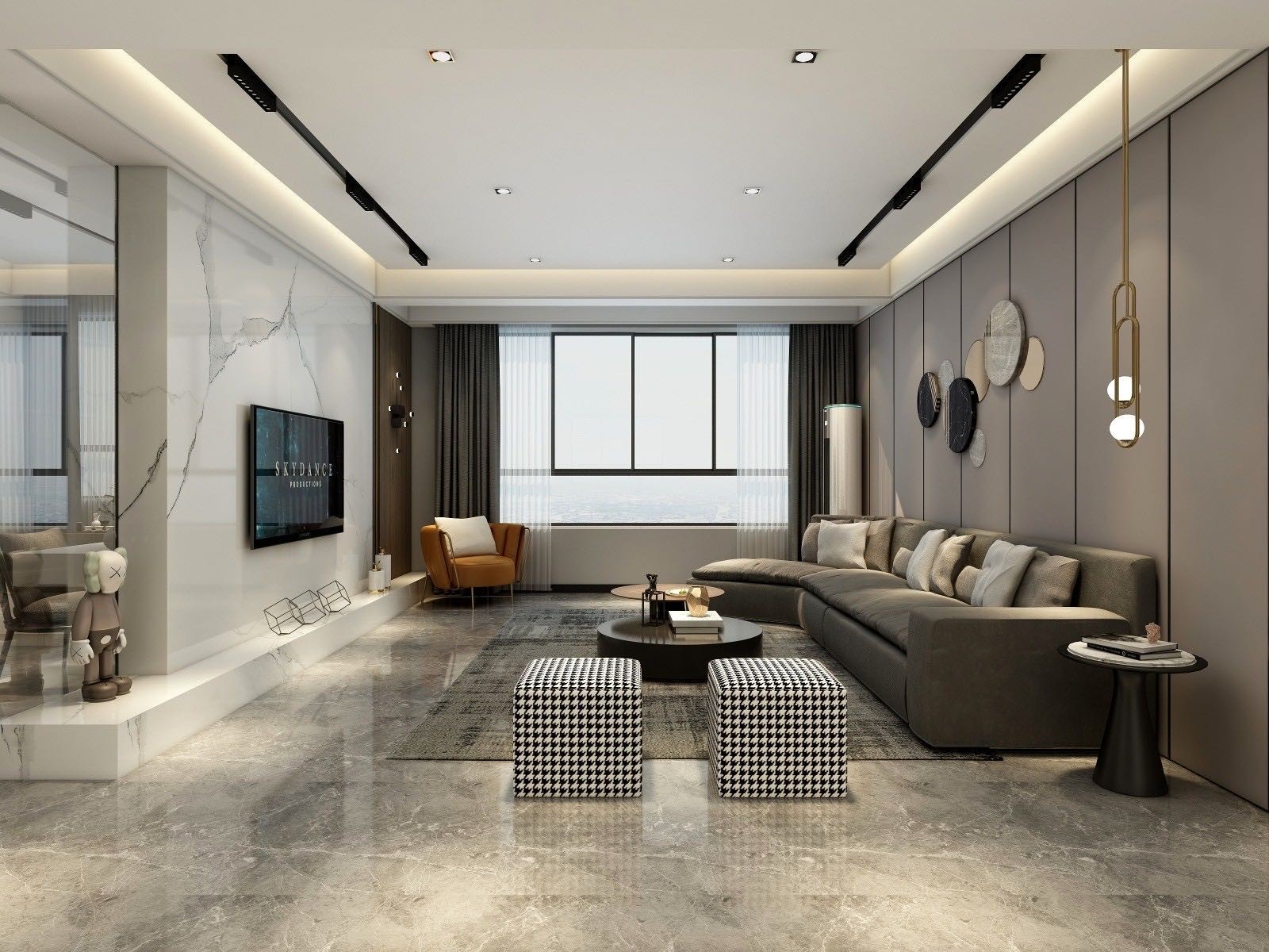 电视背景采用岩板装饰、沙发背景采用硬包装饰