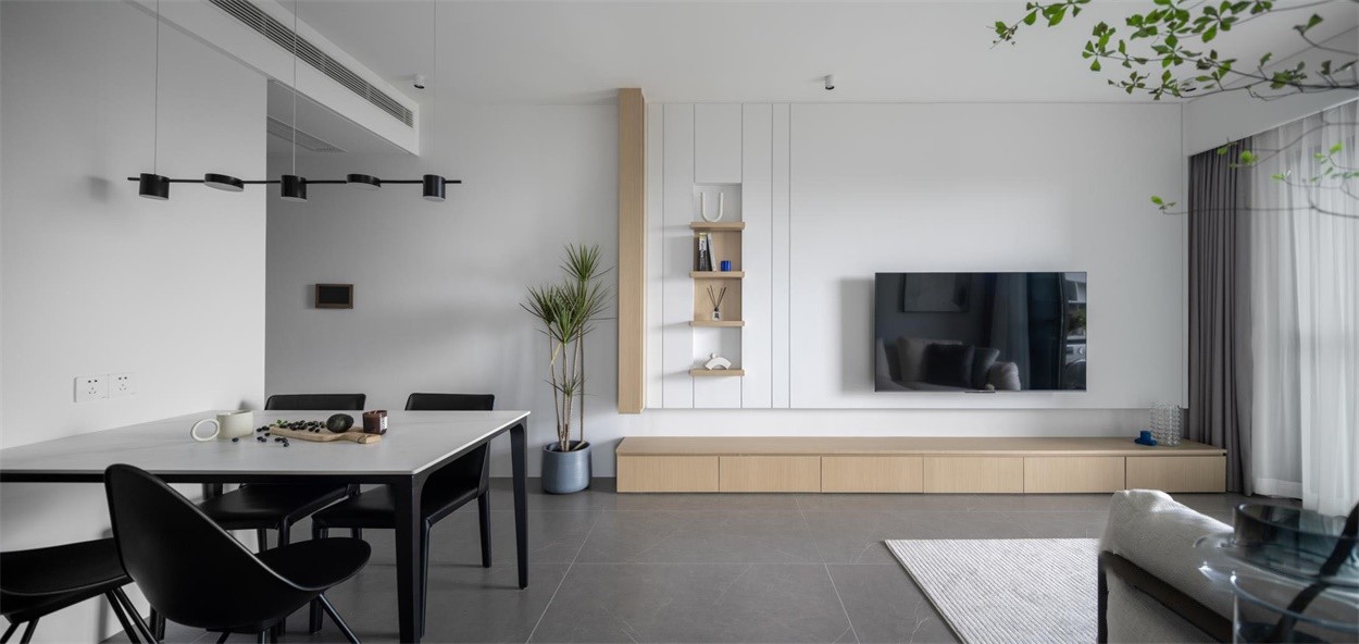 电视背景简单的工艺线条利落有致。增加木制柜面防止黑白灰调性的家里过于清冷和虚浮。电视柜下内藏灯带,点亮空间并给人一种电视背景浮于空间的灵动感。
