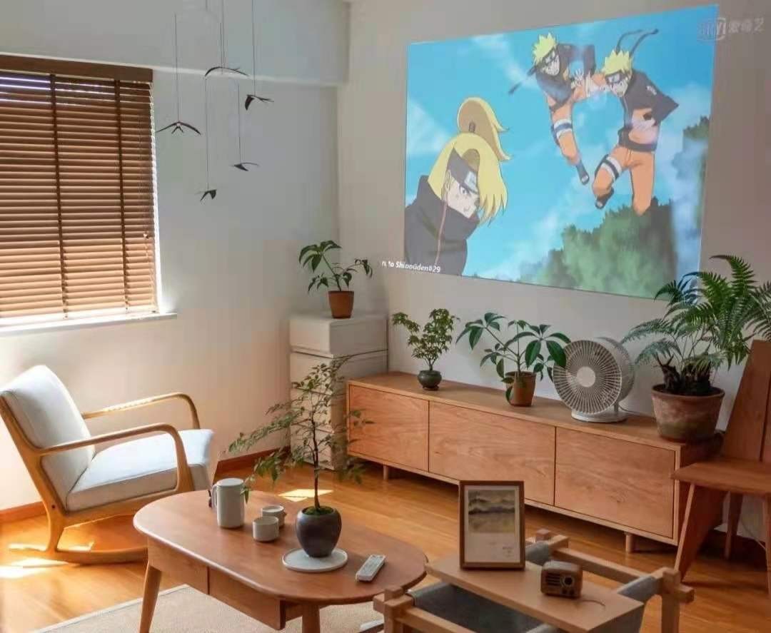 客厅顶部没有做任何造型,更加便捷的投影代替了冰冷的电视,婉约的圆形吊灯,木质百叶窗,复古的挂钟,郁郁葱葱的绿植,都让这个家呈现出最自然的状态。