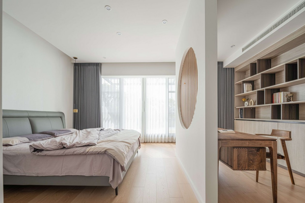 卧室的设计秉承了统一调性,没有多余的装饰堆砌,一张大床、一面木墙,以及斑驳梦幻的光影交织,便将恬静的氛围装点得甚是迷人。