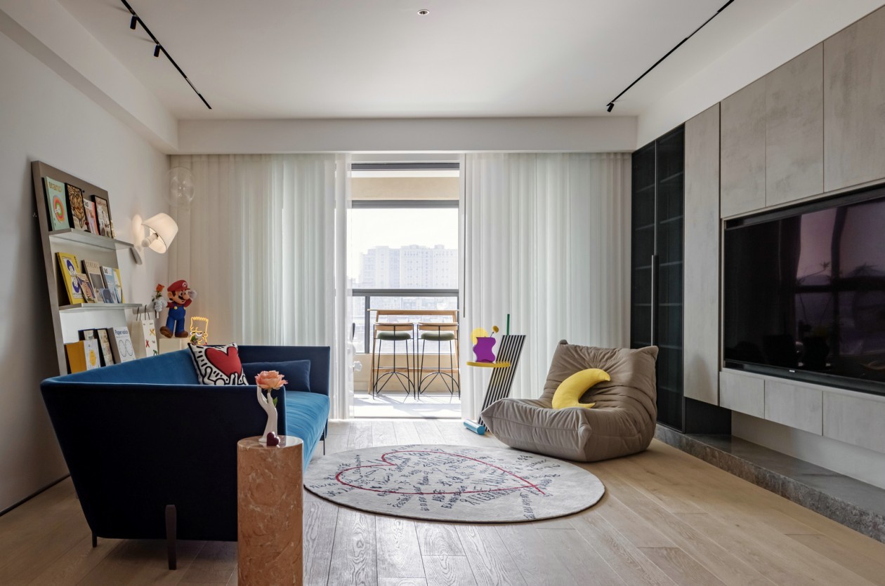 客厅电视背景整面柜体,满足了业主大量收纳与展示乐高的需求。