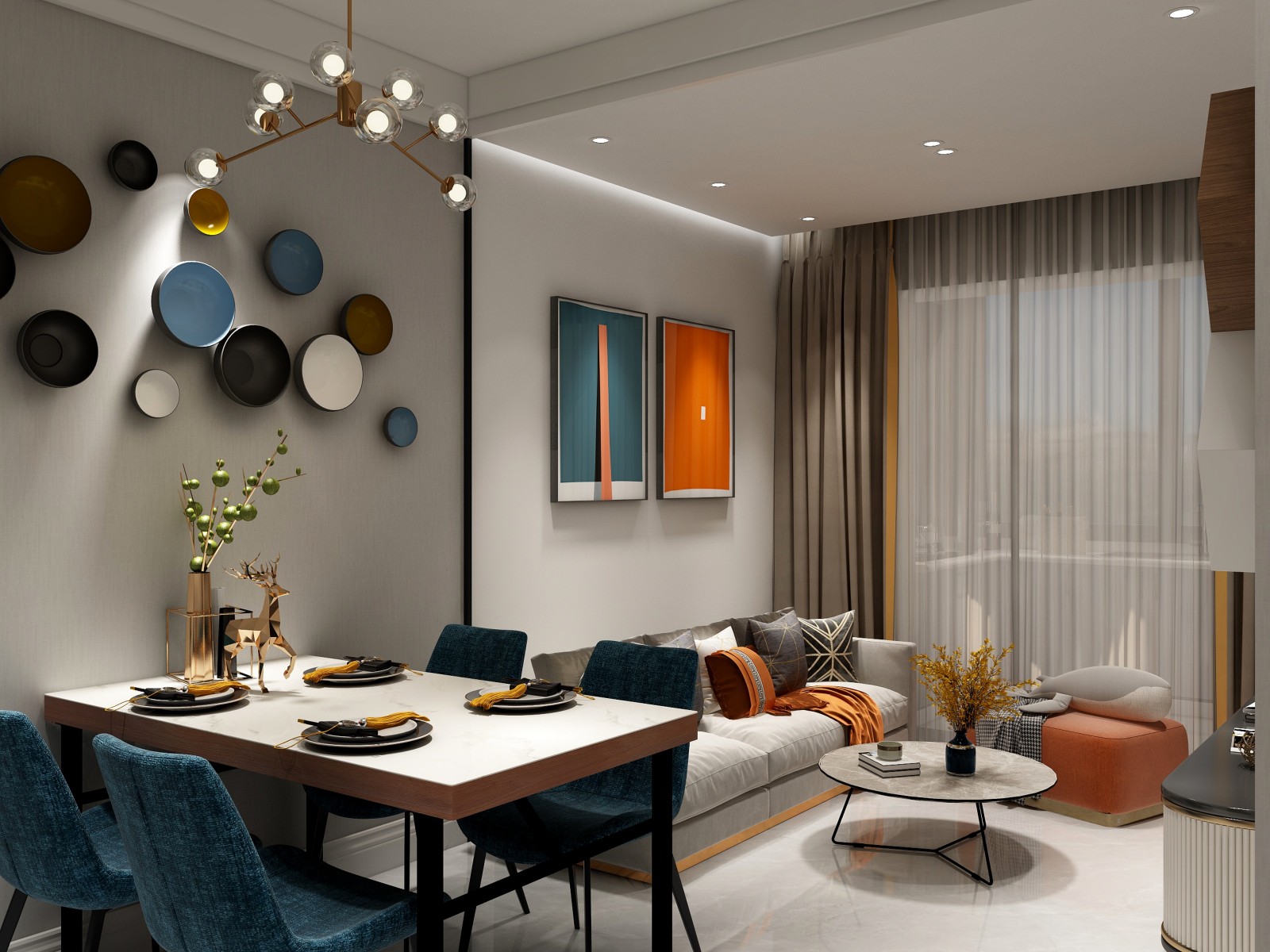 餐厅与客厅紧邻,通过墙面的色彩差异对两个空间进行分割,让每个区域更加凸显个性,使整体色彩更加多样化
