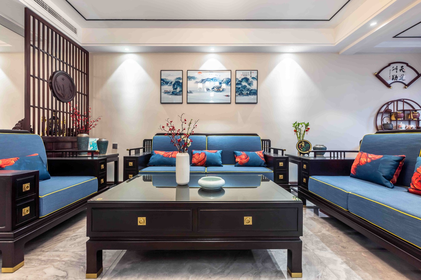 餐厅后方的装饰画一笔一划勾勒出对东方元素的尊重,让整个空间都沉寂在属于新中式的大气之中。
