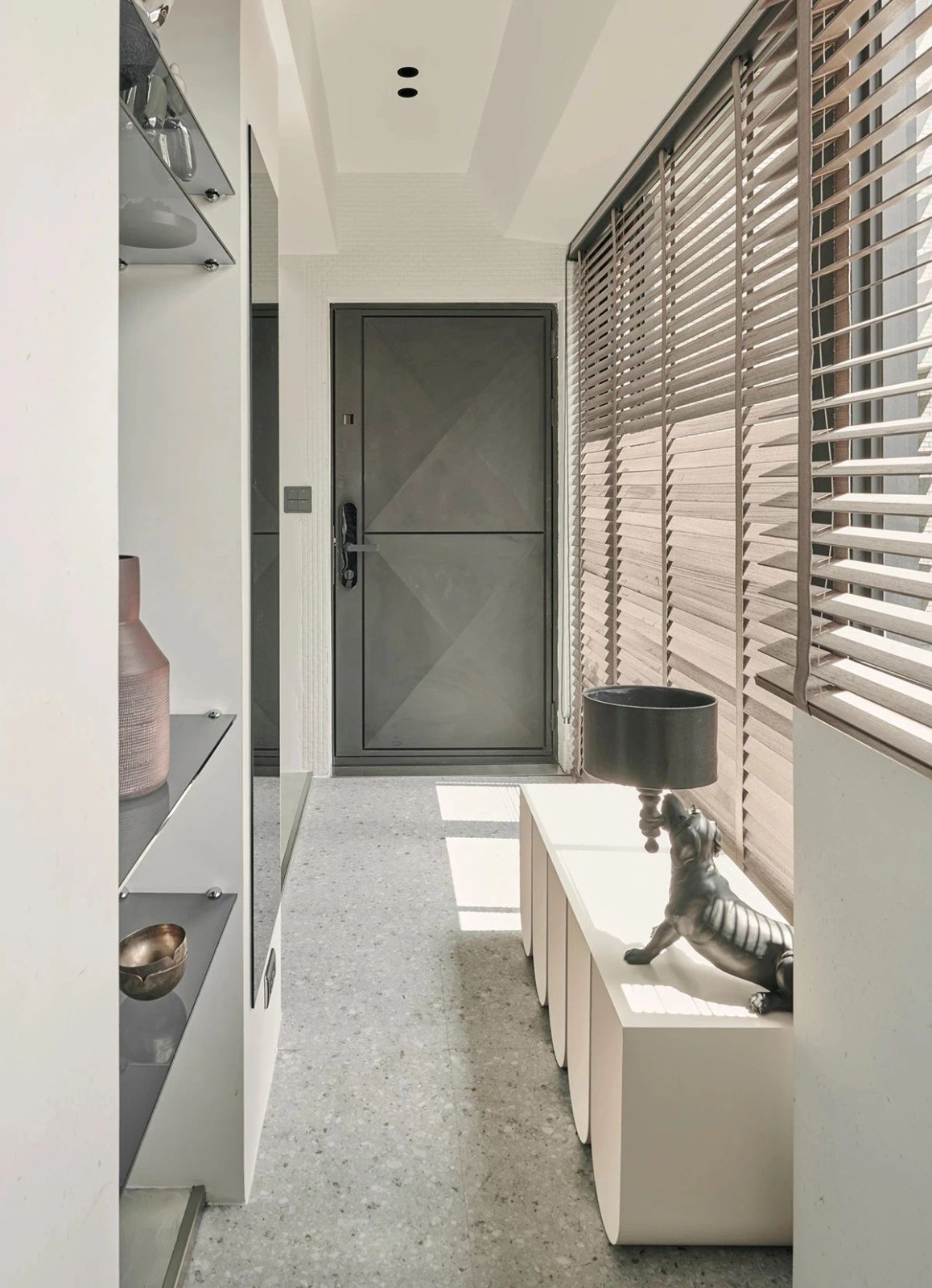 打开菱格纹定制铁门,水磨石地砖从玄关一直延伸到厨房、L型无间隔通道,让落地的木百叶窗户可以透过足够的阳光。