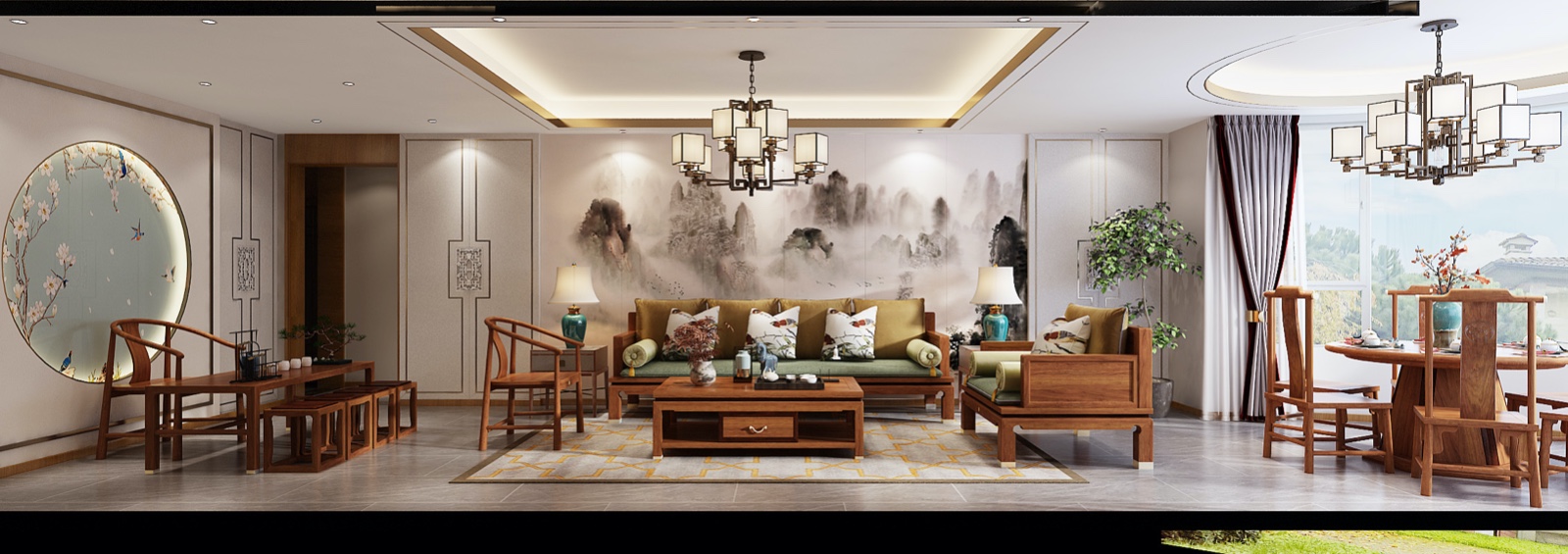 客厅整体墙面壁布,中式家具,带上新中式的线条做装饰。