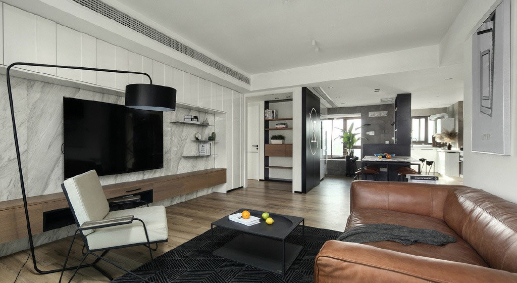 客厅电视背景墙采用岩板,做了一组柜子增加了储物功能。木地板深色原木色与墙面颜色对比鲜明。