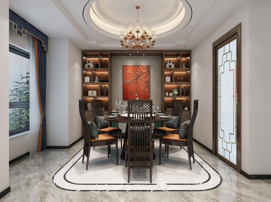 用新中式的元素对,天,地,墙,进行装饰,门窗,设计的选择,家具,布艺以及装饰品的布置,规划人体工程学。