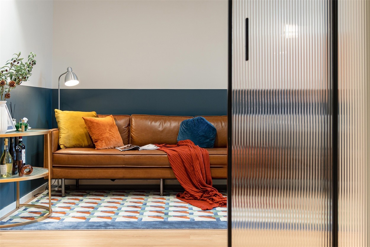 北欧表情的棕色沙发搭配落地银色铜灯,精致唯美。拼色几何地毯几乎搭上了客餐厅空间的所有色系,仿佛一个集大成者。墙面蔚蓝色半墙浮上圆形橙色色块,不禁让人联想到蔚蓝的海面,燃烧似火,悬浮其上的落日,浪漫惬意。