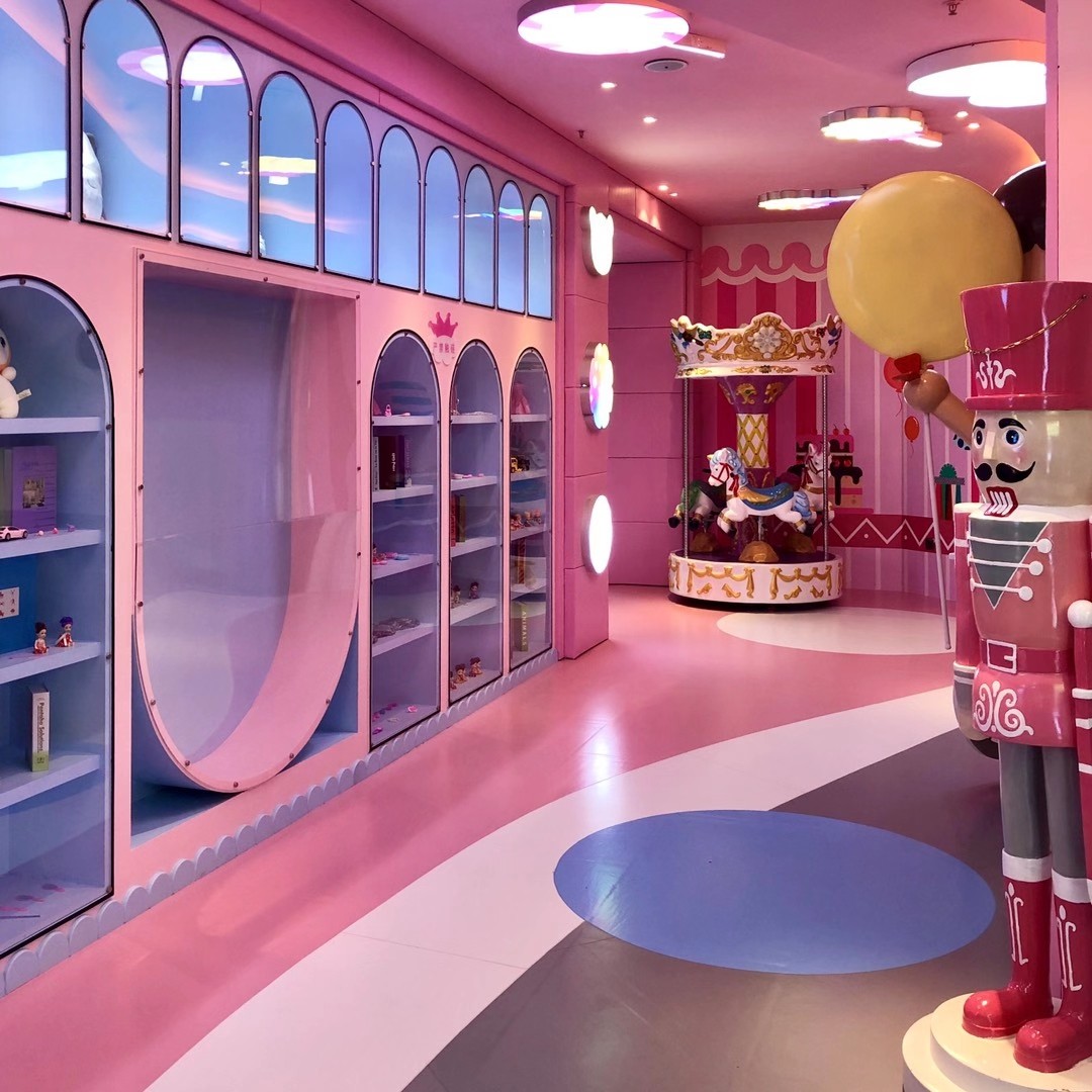 C区是“糖果主题”设计,面积比B区稍微大些,但格局差不多,都是有一个直角区域,并且通往B区会有一处狭窄空间。还有一面墙设计了满墙的展示柜。