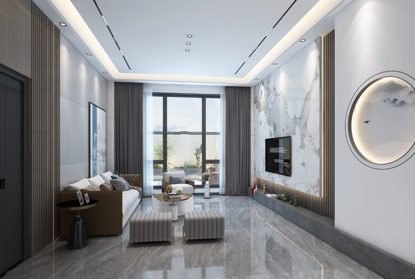 客厅电视背景墙采用白色纹理的大理石,周边采用深咖色的木饰面装饰。层次感,***感来自于颜色和材质的结合运用。