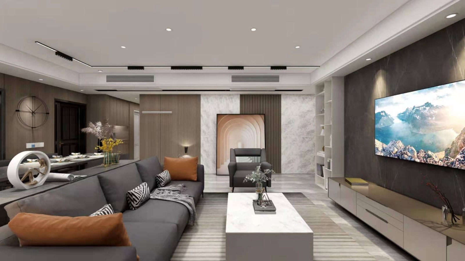 客厅视角,采用木饰面配色,深浅搭配更有视觉冲击。