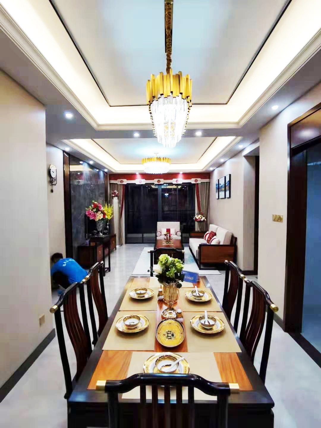 湛江吴川·财富地产中式样板间:整体效果 轻奢吊顶 采用铜+水晶搭配,柔和的灯光下,显得浪漫唯美。