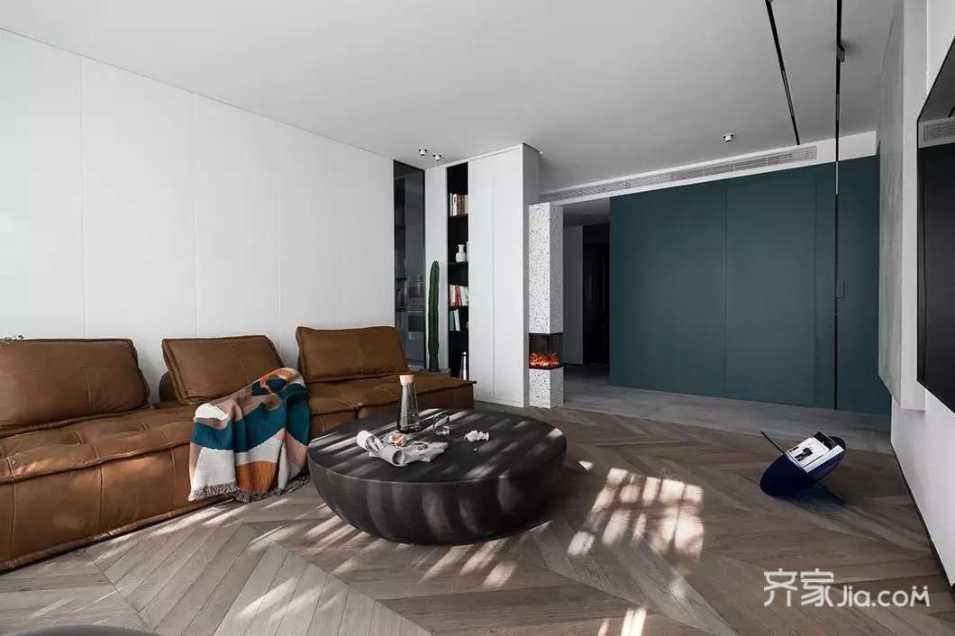 客厅沙发是由俩个方块组成。通过几何块的砌筑而成,随意拼合的单元式设计,整体造型介于沙发与卧榻之间,低矮的墩型。圆柱和长方体一体的靠背,通过调节彼此距离可以调节靠包角度,皮质上保留天然斑纹,和地面的木纹自然的光影相间。