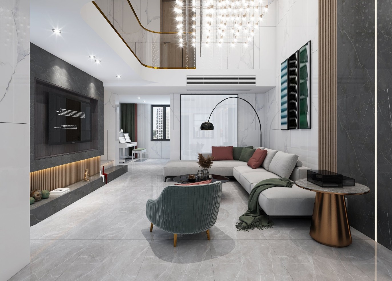铺天盖地的大理石设计加上一点色彩的点缀营造出客厅空间的***感。