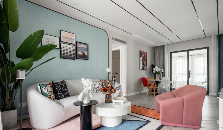 客厅在硬装上保留地板和原顶面,只做了墙面处理,将墙板铲除,重新刷漆,通过蓝色硬包背景墙来营造清爽简洁的色彩基调,辅助配色则选用了糖果色系的奶白,粉蓝,豆沙粉,橘色,像夏日的***口冰淇淋。
