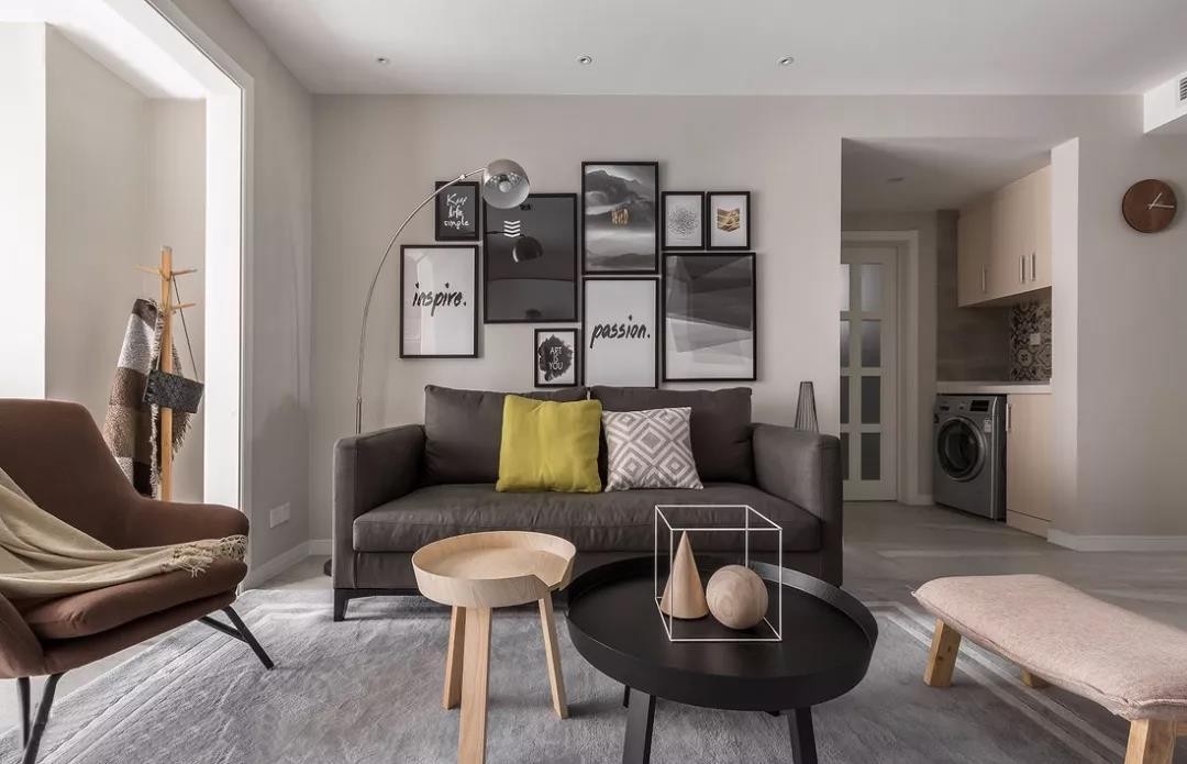 墙面采用水泥灰,搭配灰色布艺沙发、灰色地毯,背景墙以一组装饰画点缀,北欧风情简洁大方。