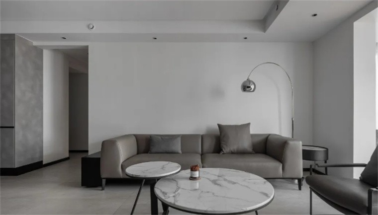客厅空间在某种程度上就是屋主的生活方式,大白墙、灰色皮质沙发、大理石与金属元素通过不同的材质增加层次感