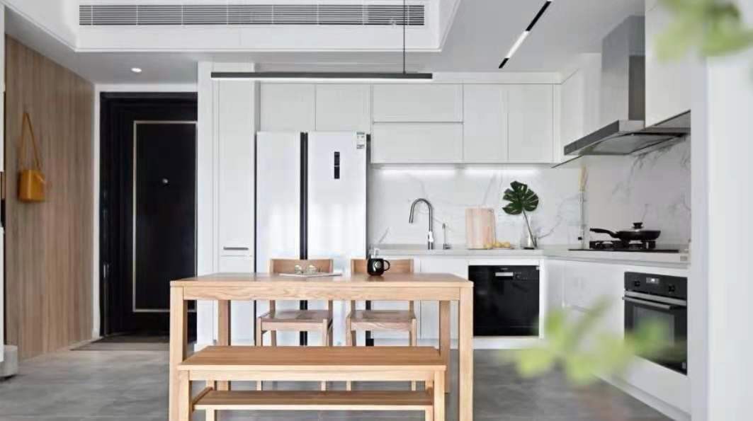 开放式厨房,材质上的软硬对比,宽敞的空间,干净的墙壁,白色的橱柜,整体干干净净。