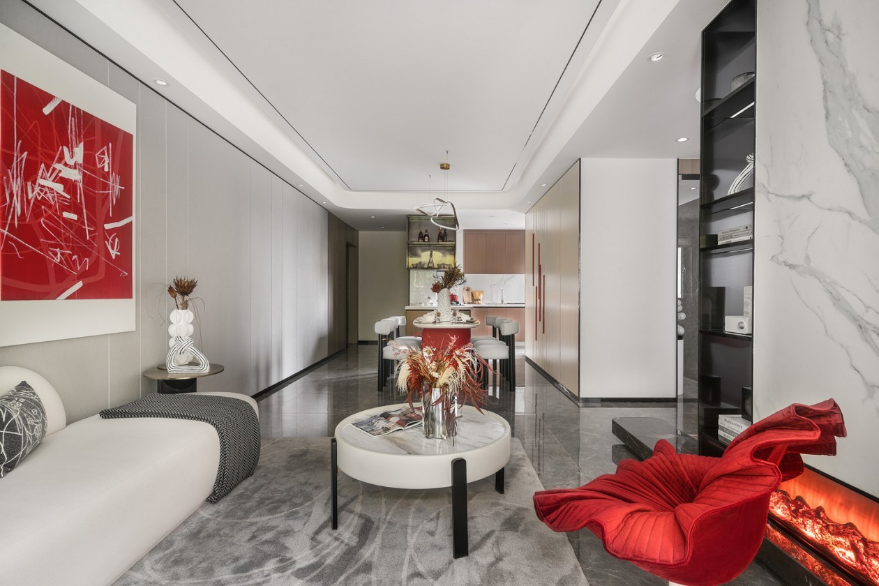 绯红象征着一种信念,纯净的白色基调与少许绯红的碰撞,渲染出生活的绚丽,在安静与热烈之间,用色调巧妙衔接起整个空间。