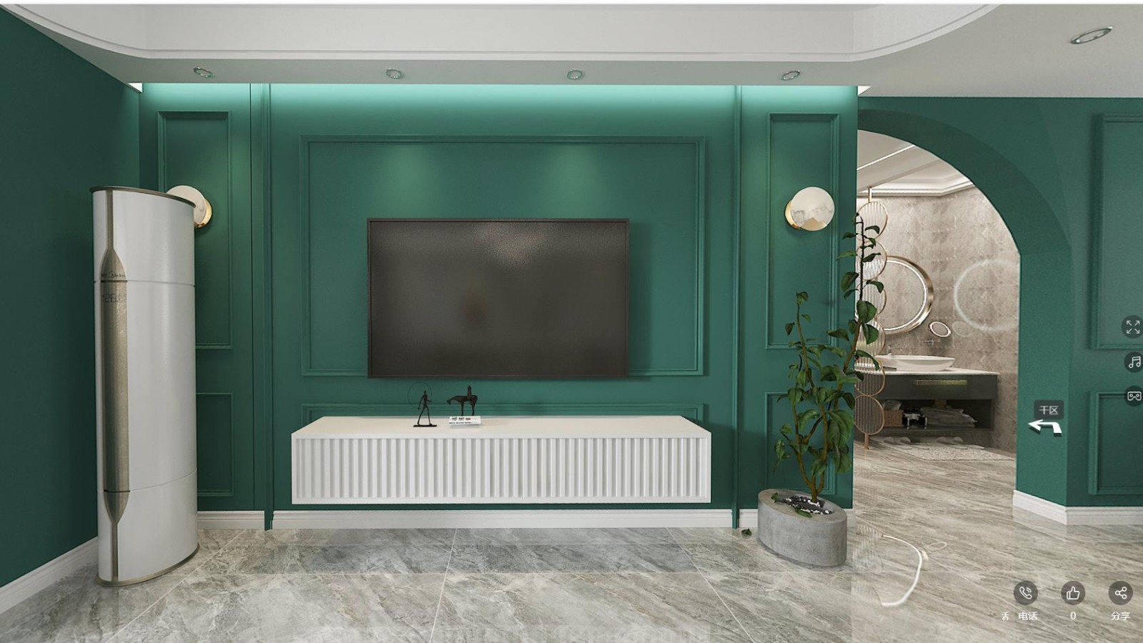 金色的玻璃屏风搭配墨绿色的玄关柜,不仅色彩上与空间大面积的绿色相呼应,金色的边框也是整体感觉更精致有品位。