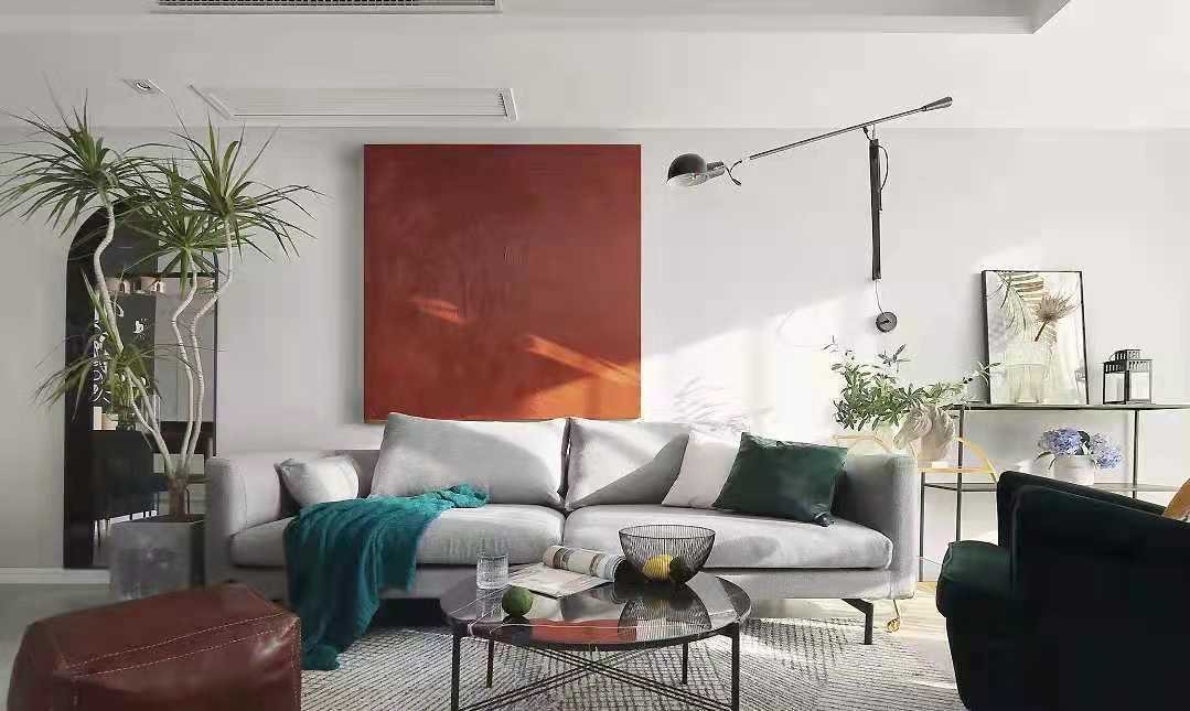客厅以优雅的灰白两色为主调,橙色挂画和黑色摇臂灯打破了灰色背景墙的单调。棕色的皮质懒人沙发和墨绿色的单人沙发作为深色,避免空间颜色过轻,整体空间更为和谐