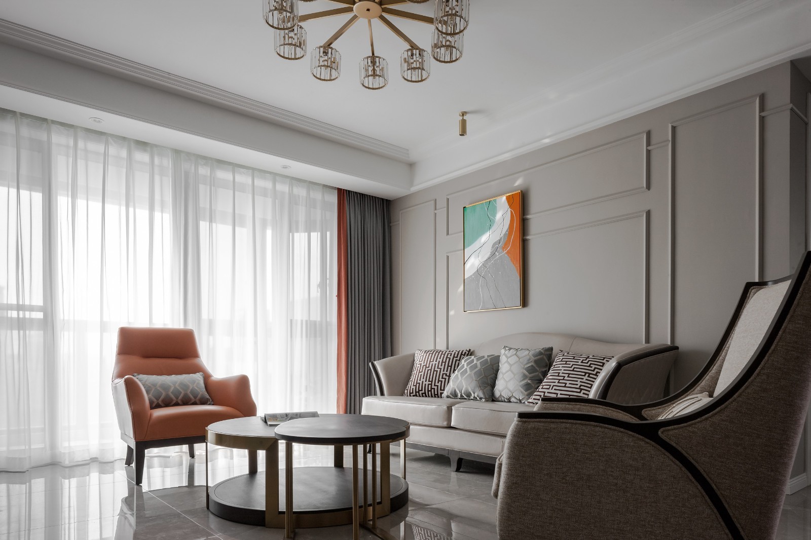 客厅采用米灰色的配色,静谧而温婉,沙发背景墙采用石膏线勾勒出小间美风,耐看的米色皮质沙发,简约有质感
