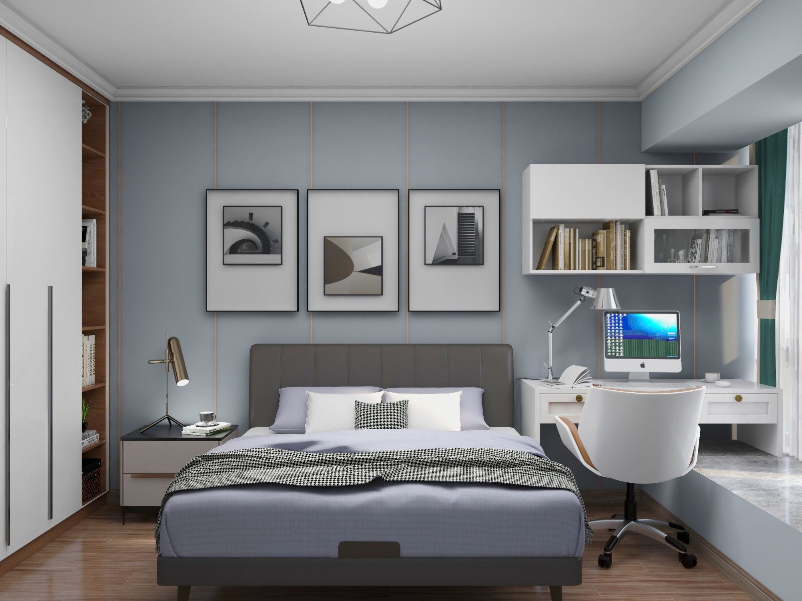 卧室背景墙采用多个壁画,储物柜采用白色门板的搭配,使整个空间看起来更加的温馨。
