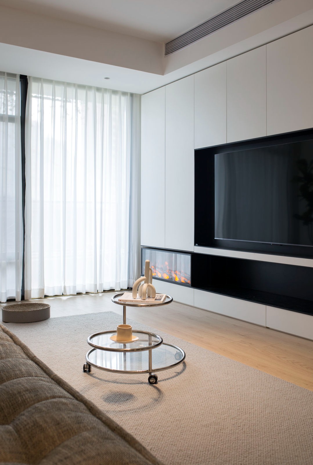 电视墙我们没有做多余的花哨处理,而是很实用的做了一整排的储物柜,简约而不简单,电视墙整面柜黑加白的搭配,内嵌电子壁炉,提升空间精致感,增强夜间整体空间的气氛。