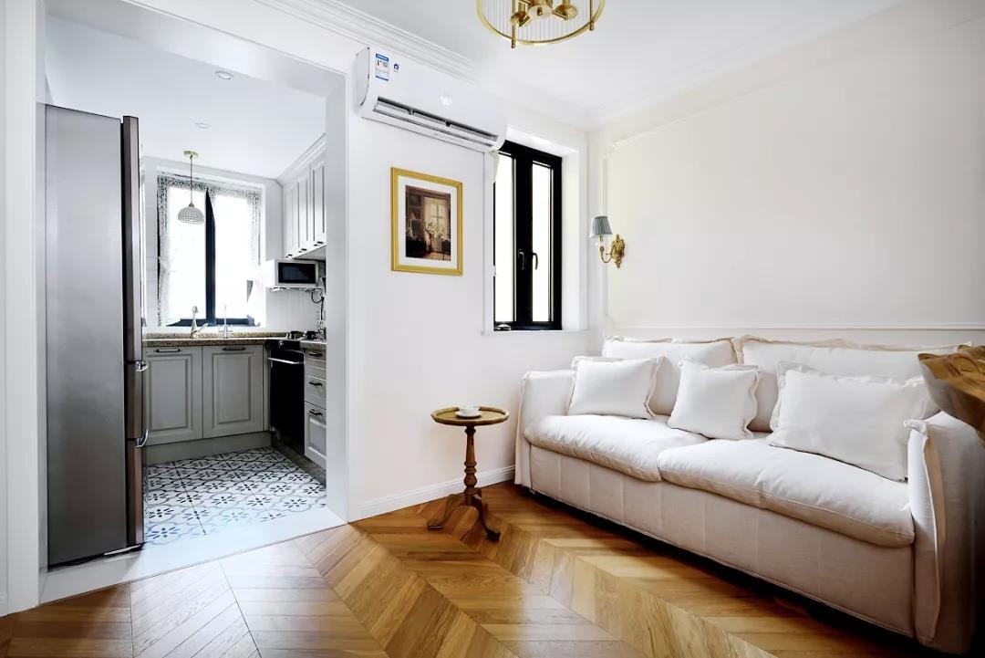 用小边几代替茶几,让原本不大的客厅显得宽敞一些。米白色的布艺沙发也显得空间更加透亮,弥补了采光不是特别充足的问题