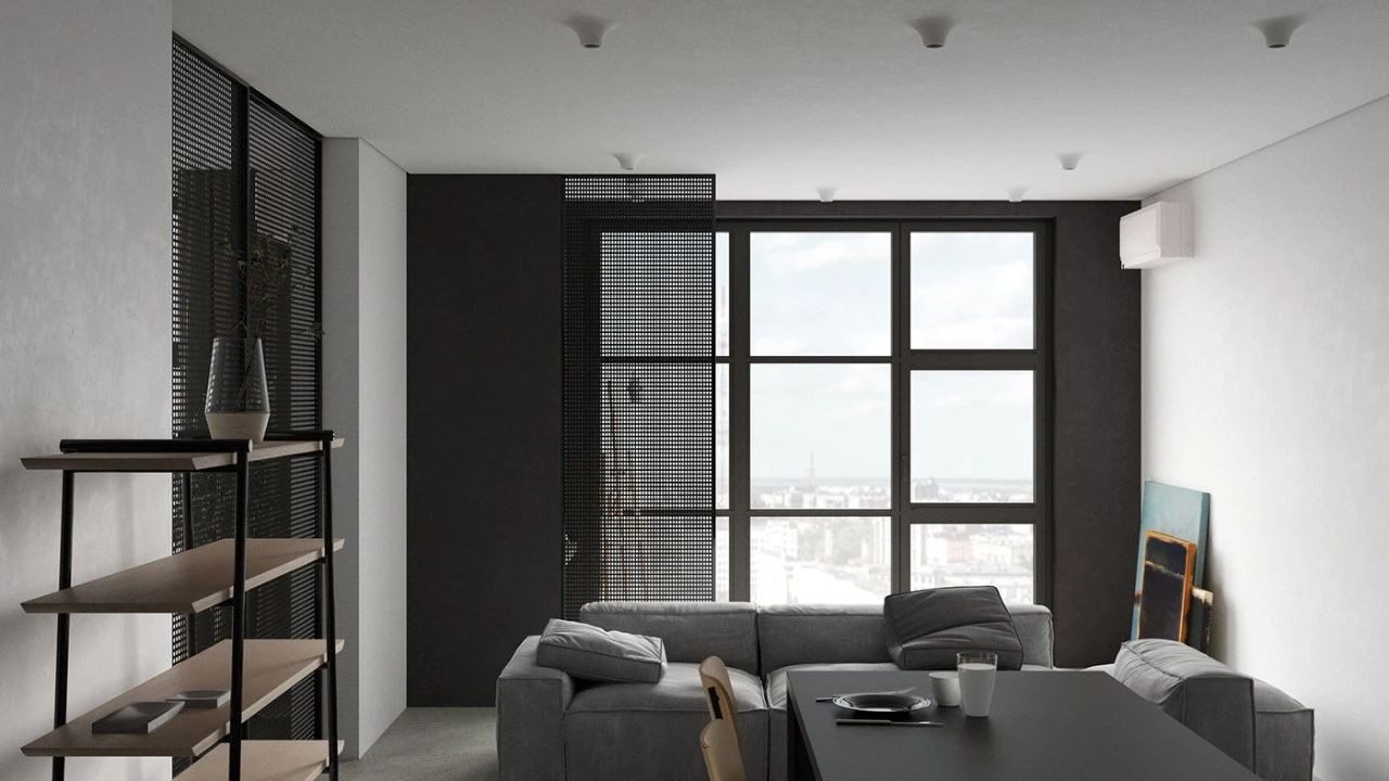 阳台和客厅之间用冲孔金属板隔开 半透的隔断保证了室内的充足的采光 黑色的金属饰面显得时尚又前卫 阳台一端写字台旁放置的画架 满足了屋主喜爱画画的需求