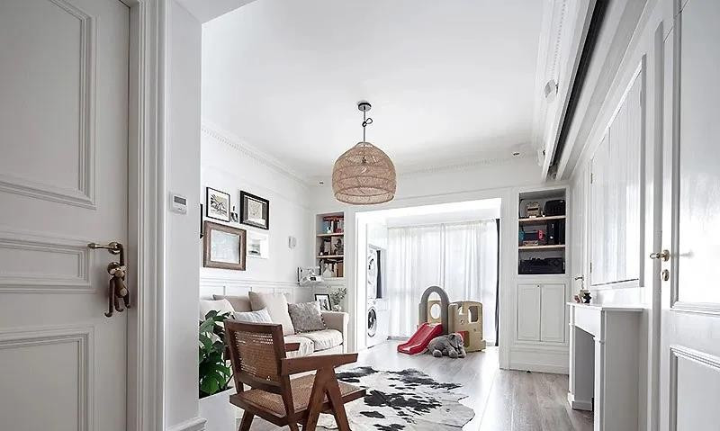 客厅的右侧紧邻儿童房,中间的隔断墙面上打通一部分做成窗户,白色折叠窗,颇有欧洲老住宅的味道。